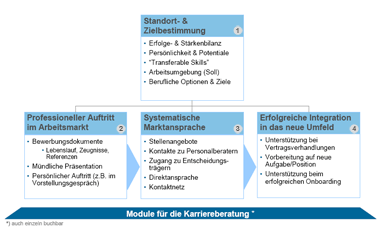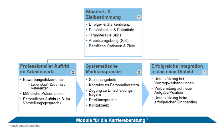 Die inhaltlichen und thematischen Schwerpunkte der Karriere-Beratung werden zusammen mit dem Privatkunden entsprechend seiner individuellen Situation, Fragestellungen und Bedürfnissen definiert. Dabei können je nach Bedarf einzelne Komponenten aus den vier Modulen der Karriereberatung individuell zusammengestellt werden.